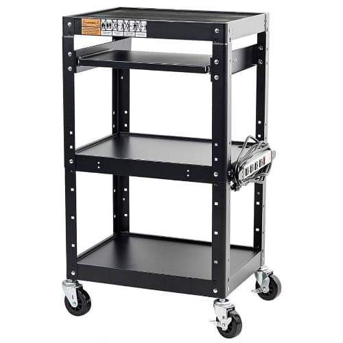 A heavy‑duty metal media cart with adjustable shelves, caster wheels and integrated power strip that turns it into a practical mobile workstation for projectors, laptops, printers, or AV presentations.